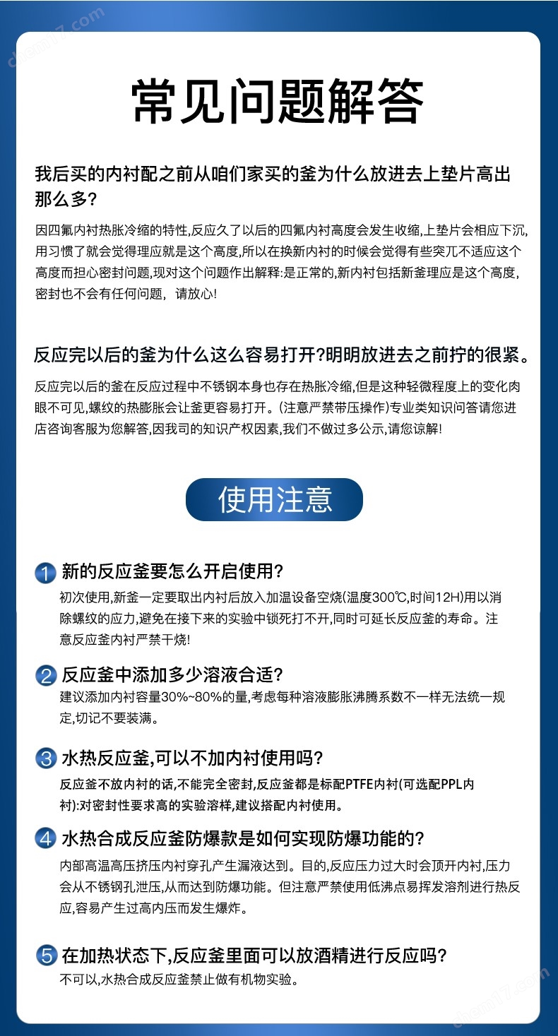 7、内衬不能单独加热,反应结束后内衬要及时清洗干净,檫干,放通风处自然烘干,不要单独加热内衬烘干,内衬如果长期不用,需要放置于不锈钢外壳,避免室温高导致内衬膨胀.